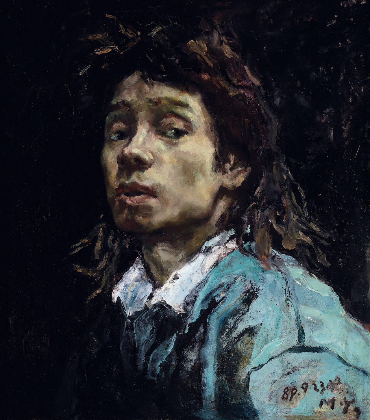 This artwork awakens our reminiscence of the Self-Portrait (The Man with a Pipe) of Gustave Courbet, a master of realism of France in 19th century because Mao Yan, inspired by the skylights of studios in the CAFA, started to look back on the classics of European classical art. In this work, the artist raises his head a little bit, while squinting at himself in the mirror from top to bottom. His hairs are loosed, spreading freely in the air. His thick and firm shoulder is covered by blue colors, which further highlights his sensitive face. The background behind the artist is deep dark, hinting some mysterious and romantic feelings and echoing with his gloomy and detached expression which is hard to understand. The oil paint used in the painting is very thin and details in the work are complex and confusing, and such treatments directly prod at the artist’s uneasiness and “neuroticism”.