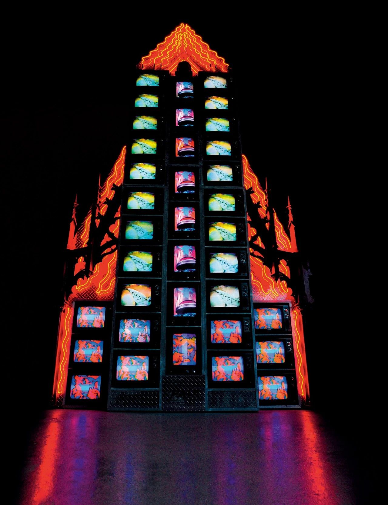 This monumental rocket-shaped installation, assembled from thirty-six 13-inch televisions, continuously displays a montage of images including Buddha statues, musical scores, and science fiction elements, all drawn from Paik’s earlier creations. The work explores the history, dissemination, and transformation of electronic imagery, while also revealing his personal reflections on themes such as the future, the universe, and space exploration.